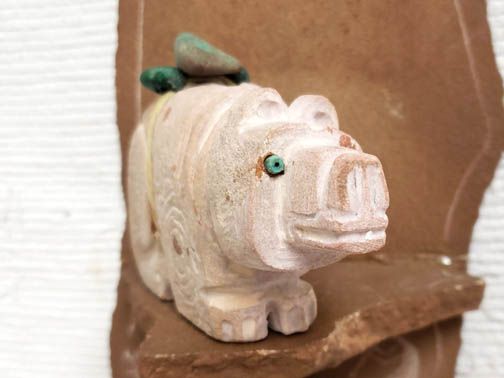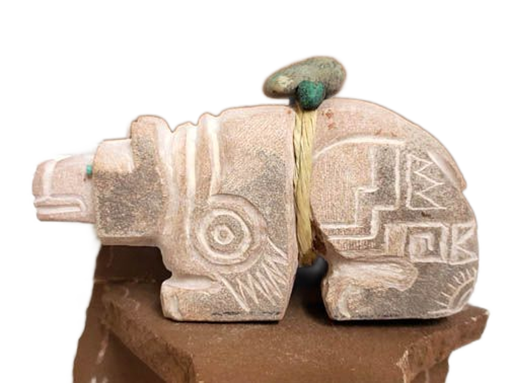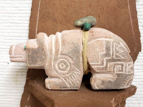 Apache Sedona Sandstone Bear. This wonderful Sedona sandstone bear is has sgraffito sides and an offering bundle of turquoise. Bear is the guardian of the West.