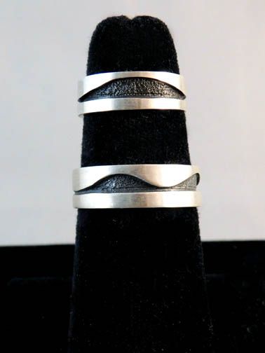 These wonderful Native American Apache Made hand-cast Sterling silver bands with overlay are simple waves and beautifully ornate. The price listed is for each.