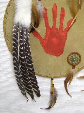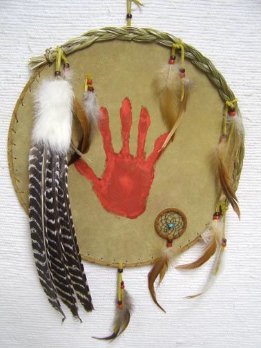 This solid buckskin shield has a sweetgrass braid around the edge, a prayer fan and a dreamcatcher attached to the shield. The handprint is an ancient sign used to show “I was here.”