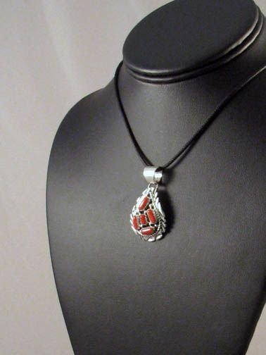This Navajo made Sterling silver pendant features a cluster of coral. The pendant is 1.625 in. long complete and one inch wide. A classic Navajo silverwork piece.