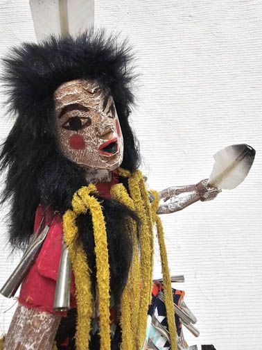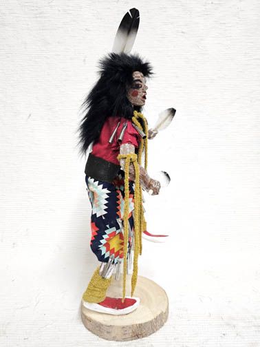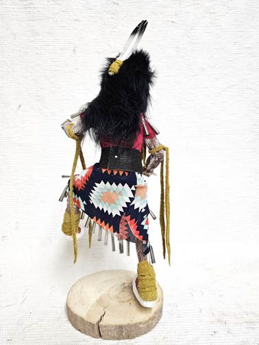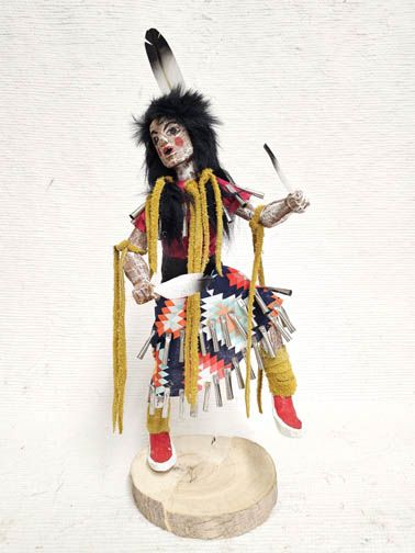Jingle Dancer Katsina Doll Dress dancing has great spiritual power, which originates as energy generated from the sound of the cones that sing out to the spirits when the dancer lifts her feet in time with the drum. The very act of dancing in this dress is a prayer for healing, and often spectators, musicians, and other dancers will make gifts of tobacco to a dancer and request that she pray for an ill family member while she dances. Very few of the artists make the Native American dolls this way. The action is wonderful and the carving, painting and details are very accurate.