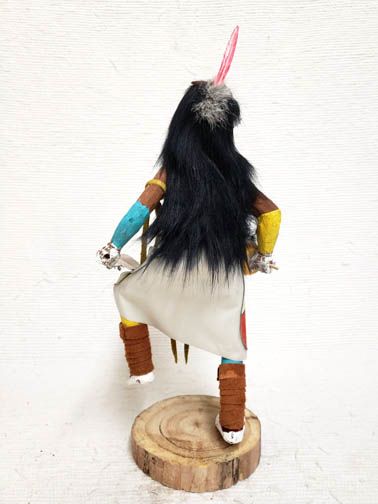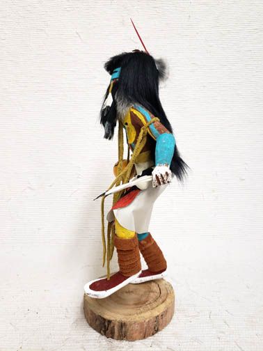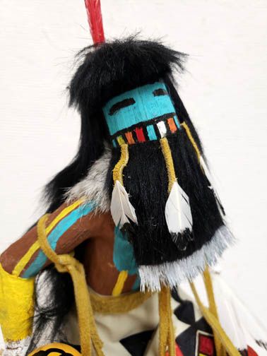 Longhair Dancer Katsina Doll. The Longhair is originally from Zuni Pueblo and he appears at most Hopi Mesas and is one of the most popular Katsinam. He wears his hair loose on his back to represent falling rain. These Katsinam appear in a group and sing a very powerful melodious song which may be one reason that they are such favorites. Their purpose is to bring rain, and it is said that they seldom dance without the appearance of a soft gentle rain to help the crops grow. This is a wonderful piece that is created in a style that is unusual today. Very few of the artists make the Native American dolls this way. The action is wonderful and the carving, painting and details are very accurate.