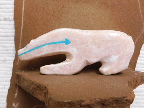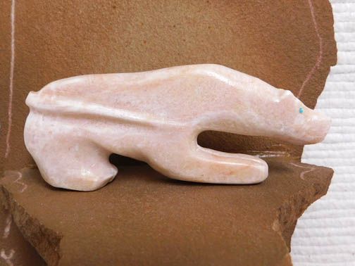 carved from pink alabaster with turquoise eyes and spirit line by Zuni artist Jimmy Yawakia.