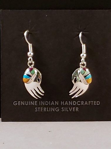 These beautiful Sterling silver bear paw earrings with inlaid shells, opal, sugilite, and turquoise were created by an unknown Navajo silversmith.