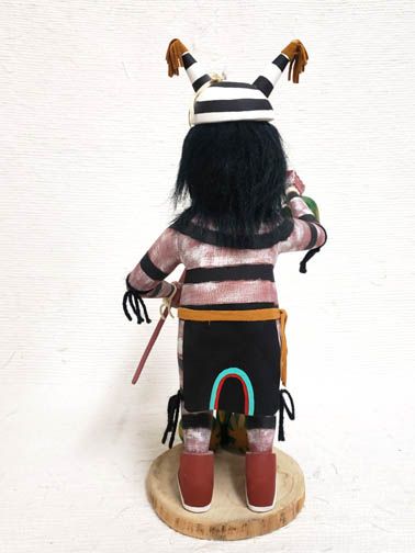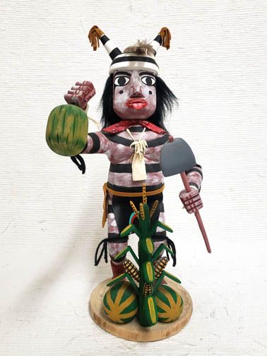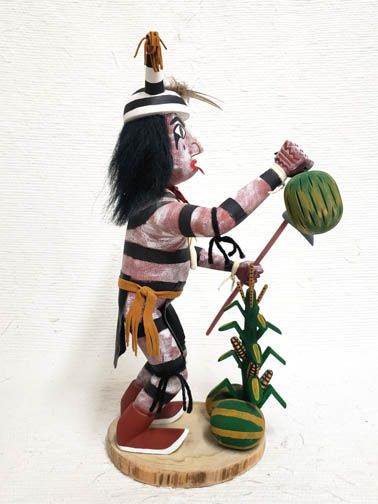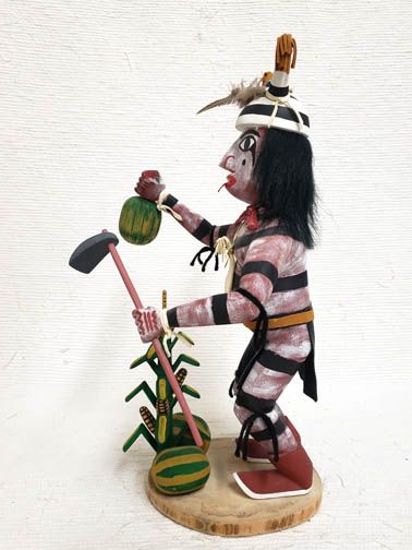 Navajo Clown Dancer Katsina. A very popular Kachina, he is easily recognized when painted with horizontal black and white stripes over his entire body. He is usually shown in a humorous pose, gorging on watermelon or some other food. There are many varieties of this Kachina. The Clown’s primary function is one of amusement for the audience during pauses in Kachina dancing or as a leavening for the seriousness of a major ceremony. Oftentimes there is an object lesson on improper behavior or a social commentary present in their skits and actions. This Clown is a harvester. He has his hoe and is watching over his corn and showing off his watermelons that are ripe.