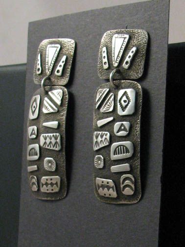 These beautiful Navajo made Sterling silver earrings are 2.125 in. total length and the small pieces are reminiscent of ancient pottery sherds. These wonderful earrings dangle off posts and are lightweight and comfortable.