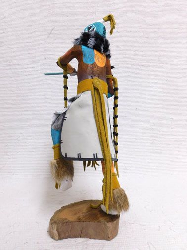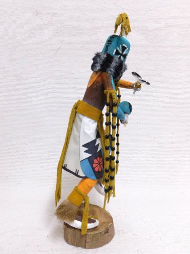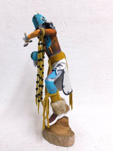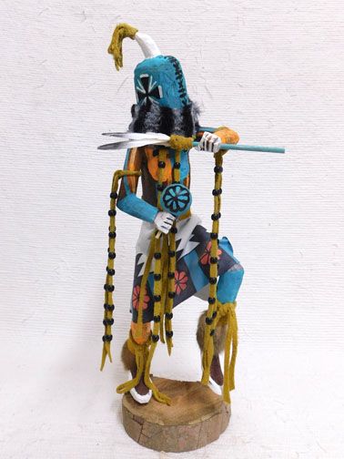 The Rattle Racer Katsina (Aya) is rarely carved. His name is derived from his mask, which resembles a Hopi rattle given to children at the Powamuya or Niman ceremonies. Aya is a name for the Hopi dance rattles. These Katsinam come to ceremonies in pairs but race one at a time. Some Aya Katsinam carry yucca whips to swat the loser of each race. The Aya wears a mask with painted designs on each side. The cross represents the four directions. The mask is marked by a black design that looks like stitches. These stitches represent the Milky Way Galaxy, or where we are in the universe. This is a wonderful piece that is created in a style that is unusual today. Very few of the artists make the Native American dolls this way. The action on this piece is wonderful and the carving, painting and details are very accurate.