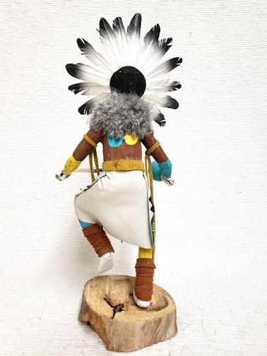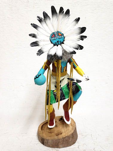 Sunface (Tawa) Katsina represents the spirit of the sun. This leader of ceremonies brings warmth, shelter for the old, a bright future, and playfulness for the young and is considered one of the more powerful Katsinam because the Sun is thought to be the brightest and largest of all the stars and essential to life and growth. This is a wonderful piece that is created in a style that is unusual today. Very few of the artists make the Native American dolls this way. The carving, painting and details are wonderful on this piece.