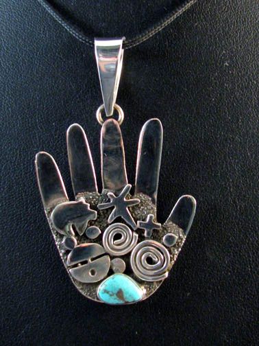 This large Sterling silver Healing Hand or Hand of Friendship pendant is appliqued with the bear, sunface, a dragonfly, stars and migration and highlighted with a single Kingman turquoise stone.