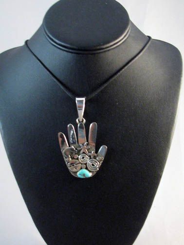 Silver Healing Hands Pendant is Native American Zuni/Navajo Made Pendant–Healing Hand with Turquoise by Alex Sanchez