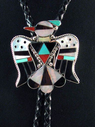 This wonderful Zuni made Sterling silver bolo with inlaid thunderbird is 2 inches tall by 2 inches wide.