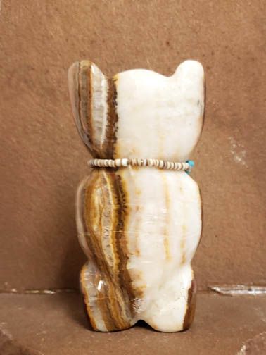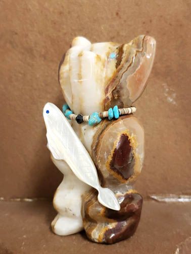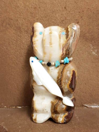 This sweet bear looks quite satisfied holding the fish he just caught. This piece was carved by Zuni artist Benina Kallestewa from striped onyx, the fish is abalone. The bear is accented with turquoise eyes and a necklace of olivella shells, turquoise and a little gemstone. Bear is the guardian of the West. Bear is associated with great strength and is considered to be a powerful healer.