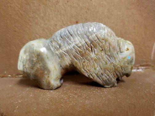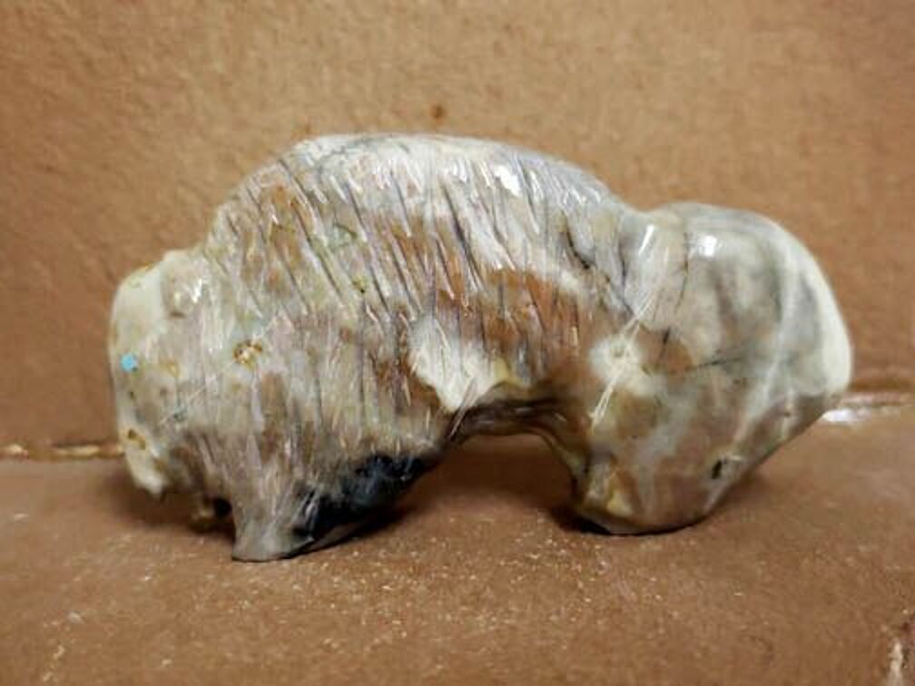 Powerful buffalo carved from Picasso marble with turquoise eyes was created by Zuni artist Jimmy Yawakia. The buffalo represents good medicine, the fulfillment of powers and steadfast endurance. The buffalo was the mainstay of the Plains Indians and was used for food as well as shelter, clothing and weapons.