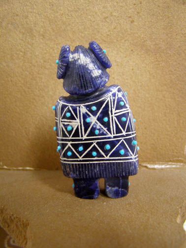 This beautiful Zuni Corn Maiden, complete with her hair in butterfly whorls, was carved from lapis with turquoise accents by Zuni fetish carver Claudia Peina.