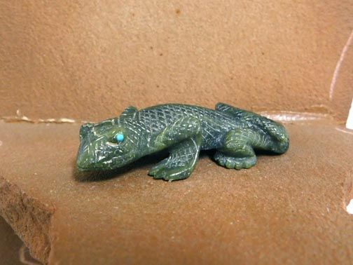 Wonderful lizard carved from ricolite with turquoise eyes by Zuni artist Fabian Cheama. The lizard helps us remember our dreams and focus on our visions.