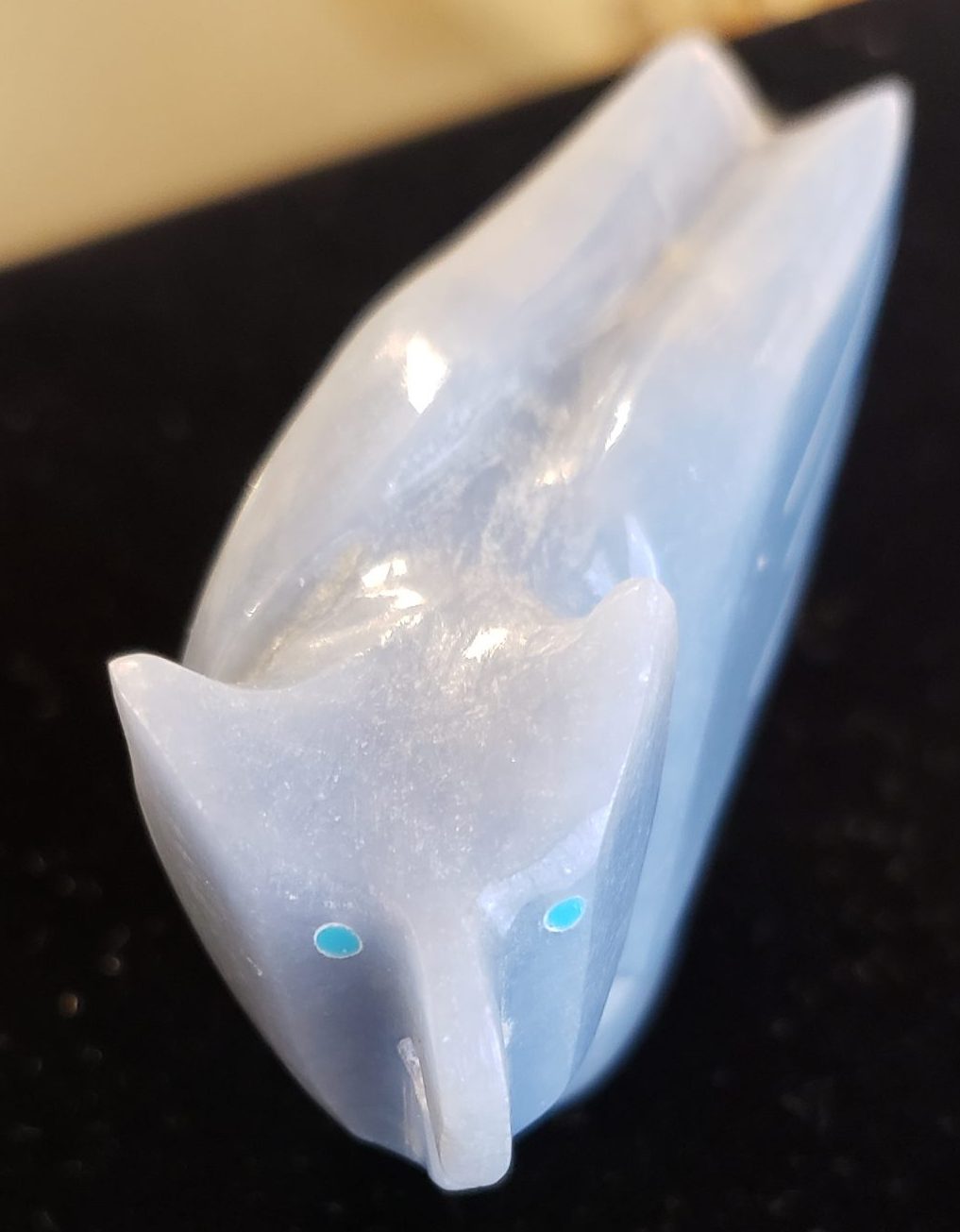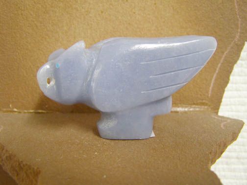 Zuni carved owl fetish is carved from Angelite is complete with turquoise eyes. Because owl is a silent hunter, he is often revered by those who provide food for the People.
