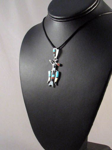 This Sterling silver thunderbird pendant is inlaid with turquoise, jet, shell and coral. The thunderbird, a powerful and mighty supernatural creature with immeasurable strength is among the most worshipped images for the Native Americans.