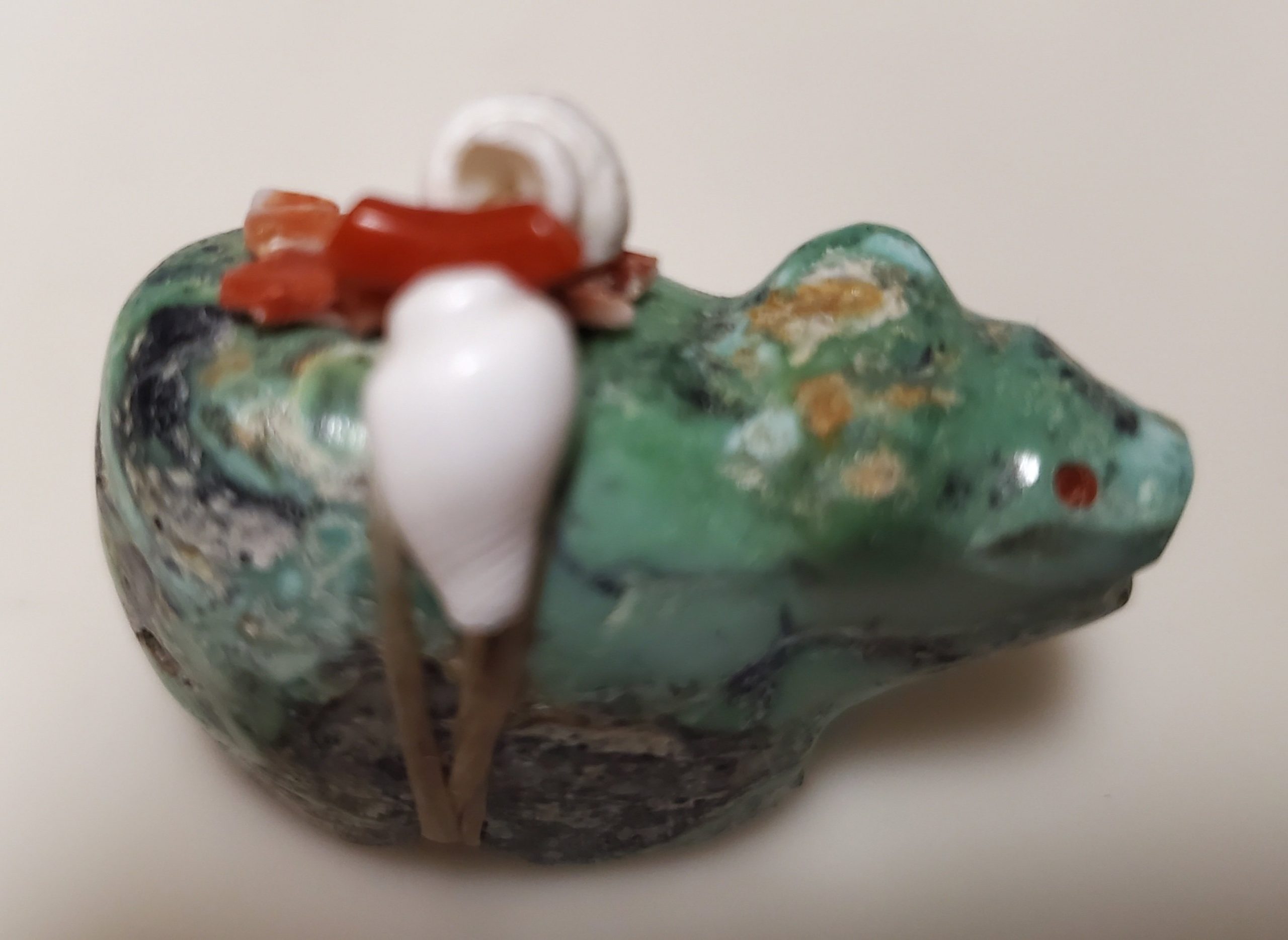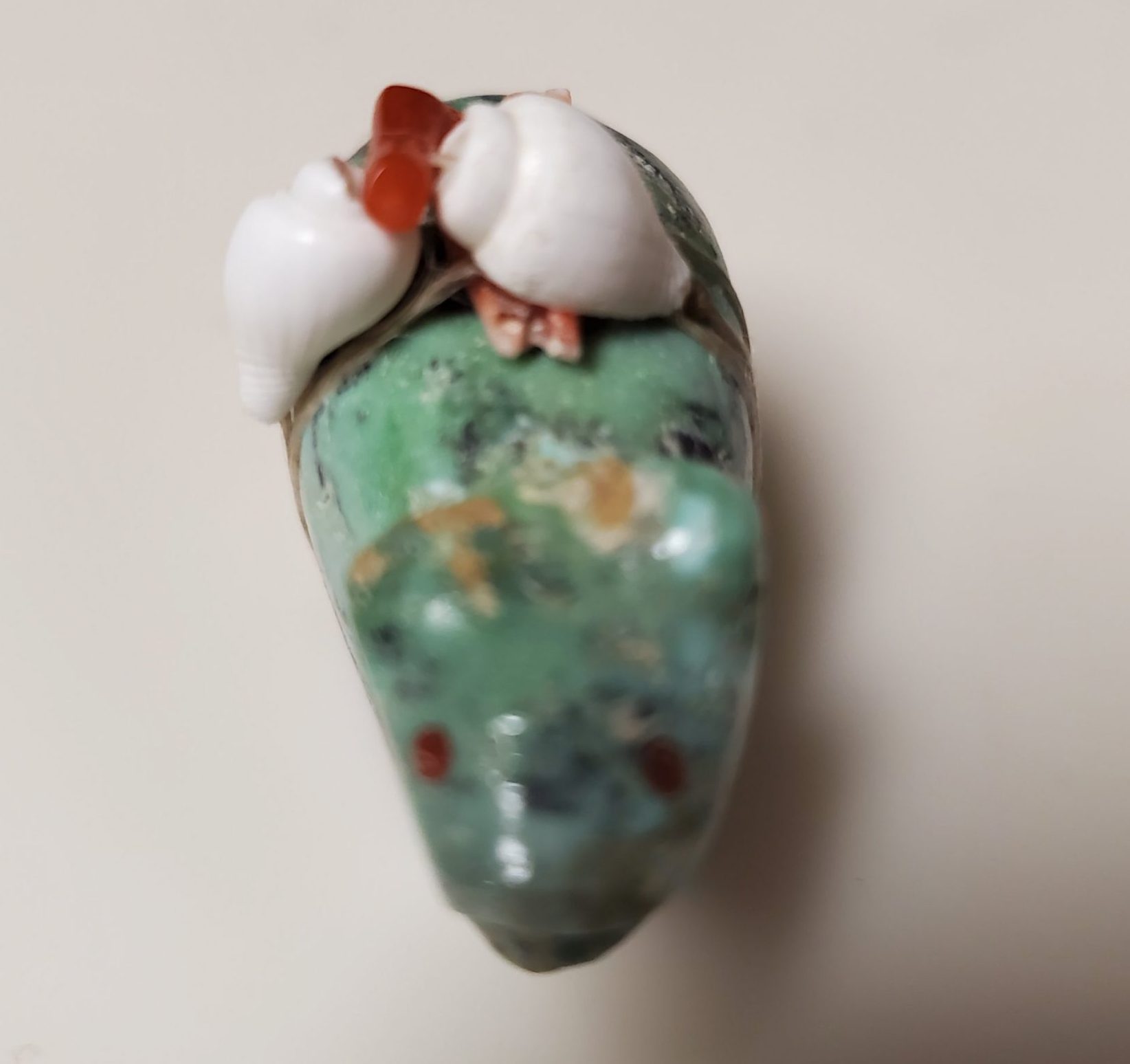 Wonderful bear carved from turquoise with coral and shell bundle by unknown Zuni fetish carver.